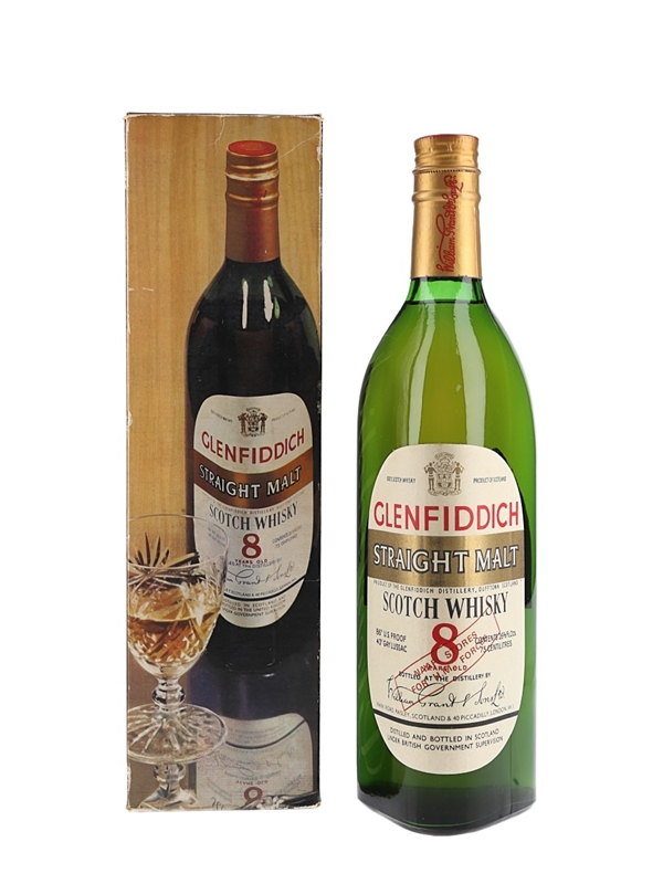 A bottle of Glenfiddich 8 Year Old straight malt Scotch whisky. We estimate this was bottled in the 1960s.
