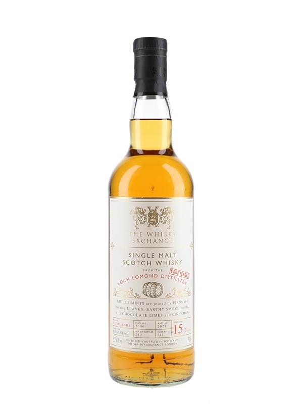 A bottle of Croftengea 15 Year Old Highland Single Malt Whisky. This heavily peated whisky was distilled at Loch Lomond distillery in 2006, matured in a single hogshead and bottled at 52.6% ABV for The Whisky Exchange.