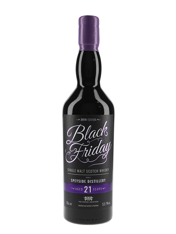 A bottle of Black Friday 21 Year Old, a Single Malt Scotch Whisky produced at un undisclosed Speyside distillery and bottled at a cask strength of 53.1% ABV. This was bottled for The Whisky Exchange to celebrate Black Friday 2019.