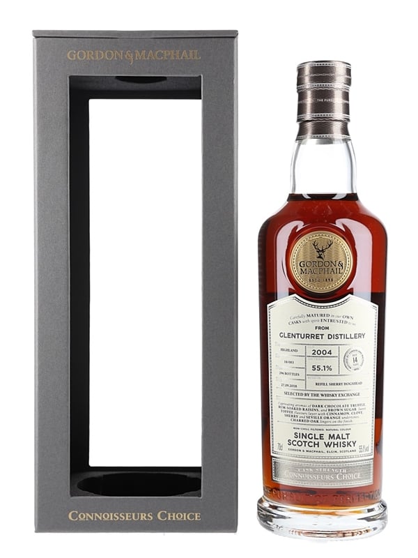 A bottle of Glenturret 14 Year Old Single Malt Scotch Whisky, bottled by Gordon & MacPhail as part of the Connoisseurs Choice series. This was distilled in 2004, matured in refill sherry hogsheads and bottled at cask strength of 55.1% ABV on 27 September 2018. This bottling was selected by The Whisky Exchange.