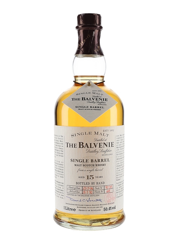 A litre bottle of The Balvenie 15 Year Old Single Barrel Malt Scotch Whisky. This was distilled on 18 July 1980, matured in a single cask and bottled on 23 July 1996.