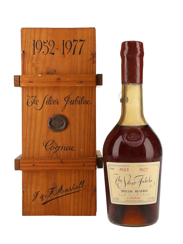 A bottle of Martell The Silver Jubilee (1952-1977). Produced to commemorate the Queen's Silver Jubilee in 1977, this Cognac is blended from the 1815, 1906, 1914 and 1918 vintages. Chairman Michel F. Martell said at the time that these eaux-de-vie used were 'from the finest growths and were chosen for their bouquet and palate, which are unsurpassable'.