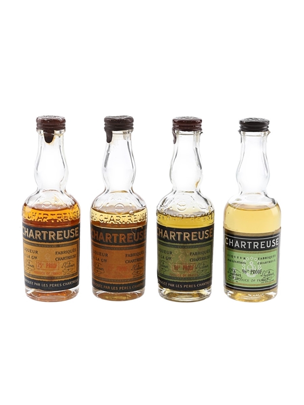 This lot contains four miniature bottle of Chartreuse liqueur produced in France. We estimate these were bottled in the 1950s to 1960s.