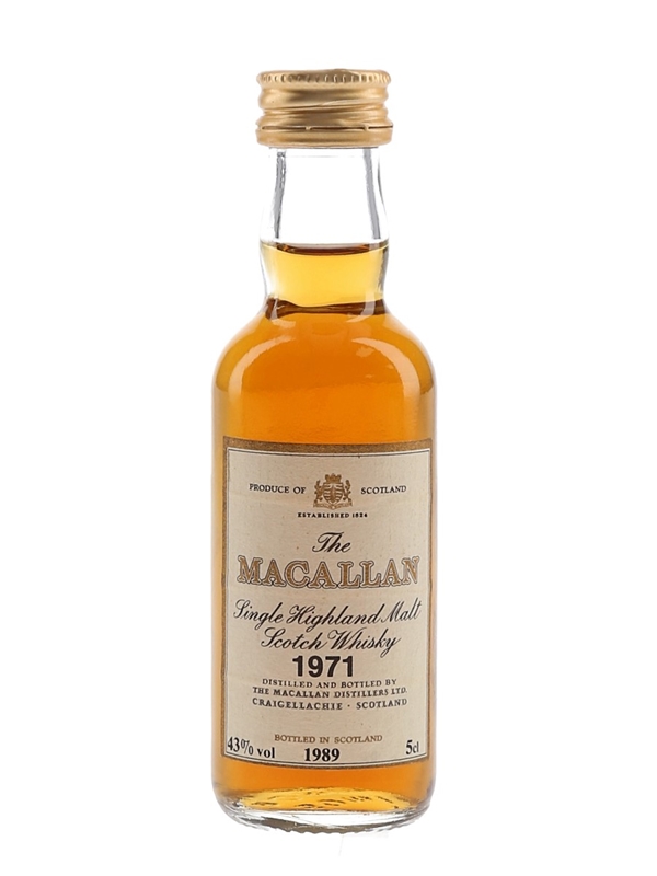 A miniature bottle of The Macallan 1971 Single Highland Malt Scotch Whisky. This was distilled in 1971 and bottled at 43% ABV in 1989.