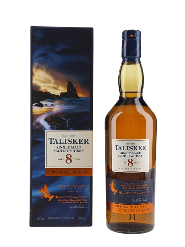 A bottle of Talisker 8 Year Old Made By The Sea Single Malt Scotch Whisky. Distilled in 2009 matured in ex bourbon American oak before bottling in 2018 at natural cask strength of 59.4%.