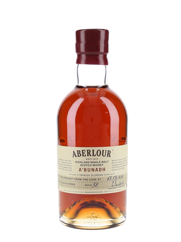 A bottle of Aberlour A'bunadh Highland Single Malt Scotch Whisky, matured in a Spanish oloroso sherry butt and bottled at 61.1% ABV.