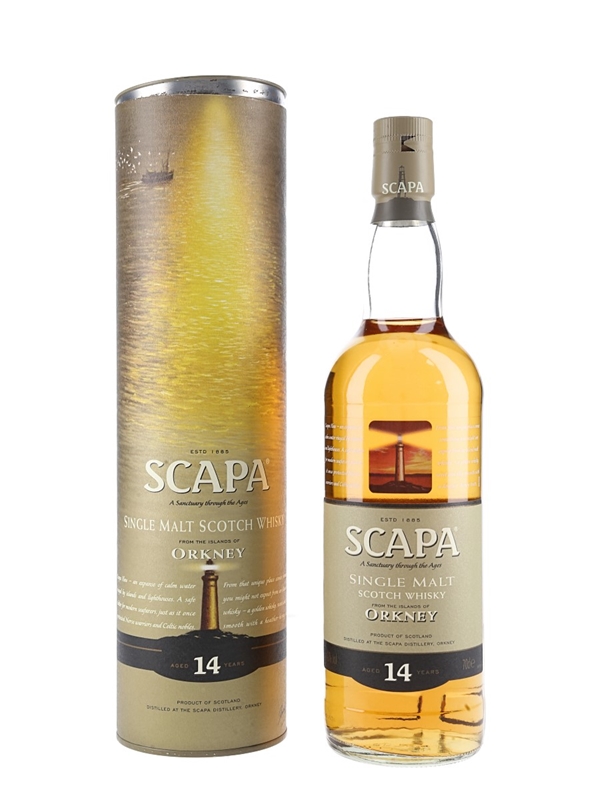 A bottle of Scapa 14 Year Old Single Malt Scotch Whisky. This expression replaced the 12 year old in the mid 2000s, and was itself replaced by the 16 year old in 2008, which has become Scapa's entry level bottling.