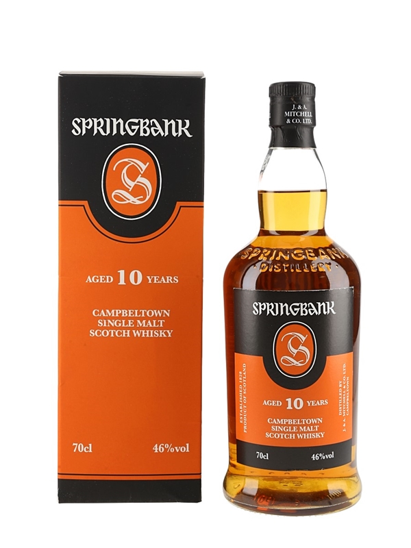 A bottle of Springbank 10 Year Old Campbeltown Single Malt Scotch Whisky. The bottling code indicates this was bottled in 2021.