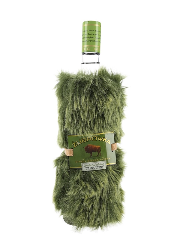 A bottle of Zubrowka Bison Grass Vodka, produced and bottled by Polmos. This bottle is presented in a furry jacket sleeve.