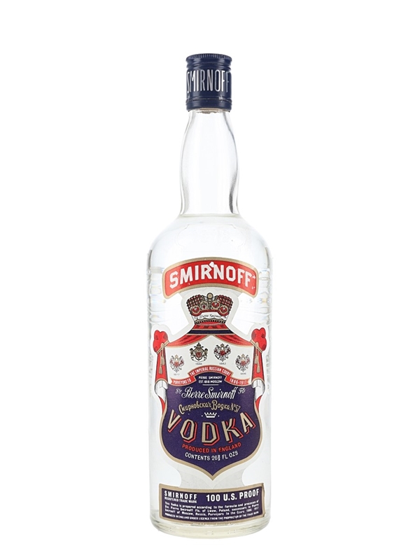 A bottle of Smirnoff Purple Label vodka. This was produced and bottled in England under license from the proprietor of the Trade Mark. We estimate this was bottled in the 1970s.