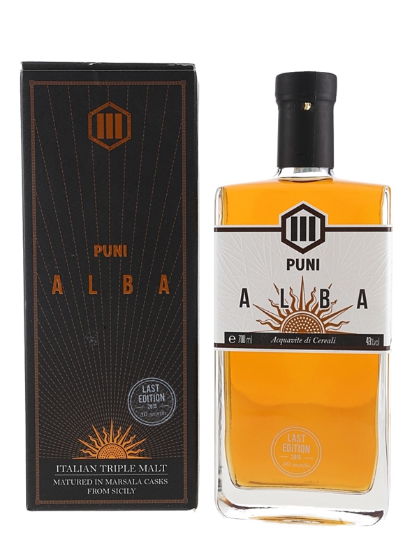 A bottle of Puni Alba 3 Year Old Acqavite di Cereali Italian Malt Whisky matured in Marsala wine casks.
