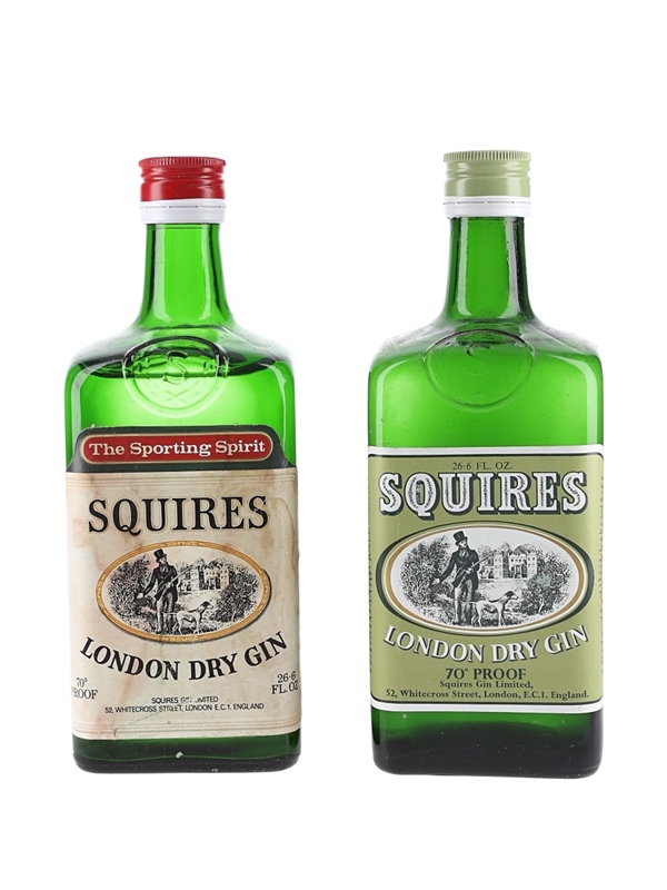 This lot contains two 75.7cl bottles of Squires London Dry Gin. We estimate these were bottled in the 1970s.