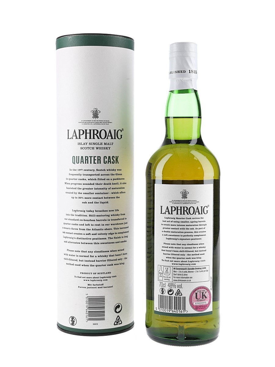 A bottle of bottle of Laphroaig Quarter Cask Islay Single Malt Scotch Whisky, distilled by D. Johnston & Co. and bottled at 48% ABV.