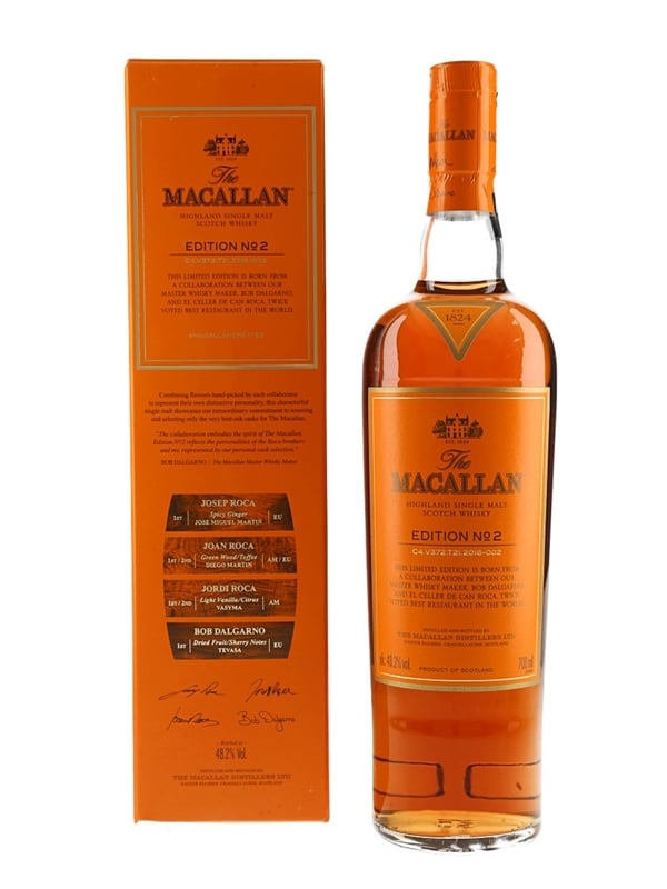 A bottle of The Macallan Edition No.2 Highland Single Malt Scotch Whisky bottled at 48.2% ABV. This is a limited edition matured in four distinct cask types selected by master blender Bob Delgarno and Spanish chefs Joan, Josep and Jordi Roca from El Celler de Can Roca. The restaurant was twice voted best restaurant in the world.