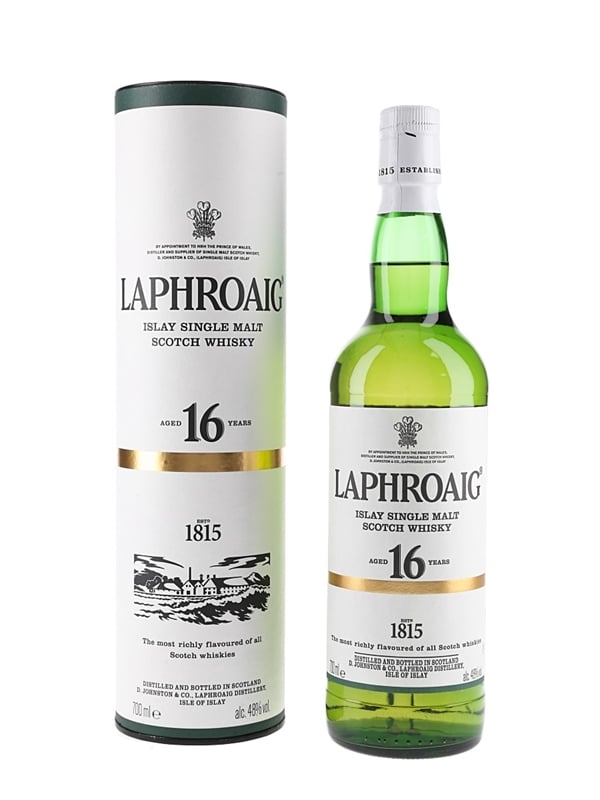A bottle of Laphroaig 16 Year Old Islay Single Malt Scotch Whisky. This was matured in first fill ex-bourbon barrels and bottled at 48% ABV.