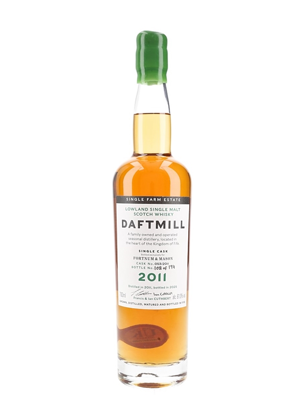 A bottle of Daftmill Lowland Single Malt Scotch Whisky. This was distilled in 2011, matured in a single American bourbon barrel and bottled in 2025 at 61% ABV exclusively for Fortnum & Mason.