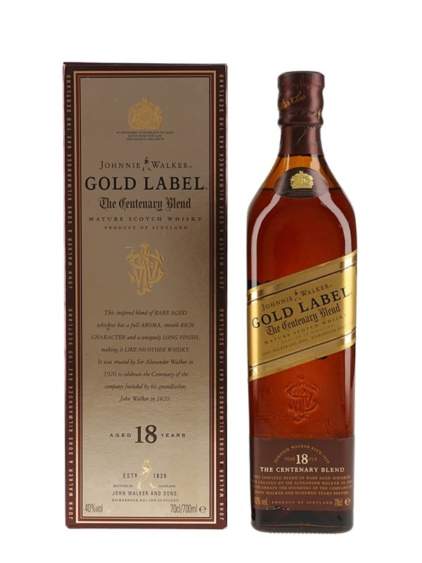A bottle of Johnnie Walker Gold Label 18 Year Old The Centenary Blend Blended Scotch Whisky, released before the brand dropped the age statement.