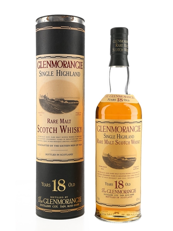 A bottle of Glenmorangie 18 Year Old Single Highland Rare Malt Scotch Whisky. We estimate this was bottled in the 1990s.