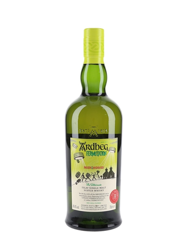 A bottle of Ardbeg Fermutation 13 Year Old The Ultimate Islay Single Malt Scotch Whisky, Invasion of the Washbacks. This Ardbeg Committee Only Edition of 2022 was bottled at 49.9% ABV and had the longest fermentation in Ardbeg's history.