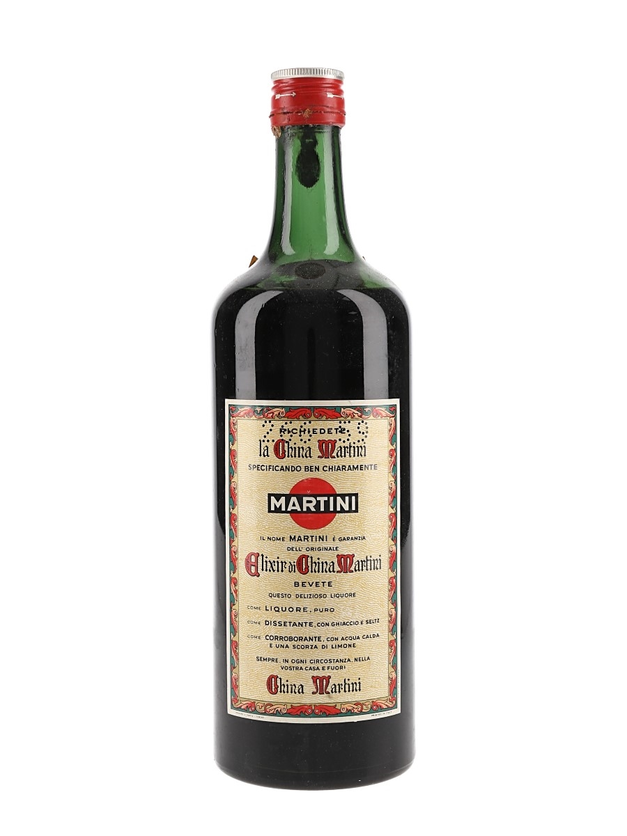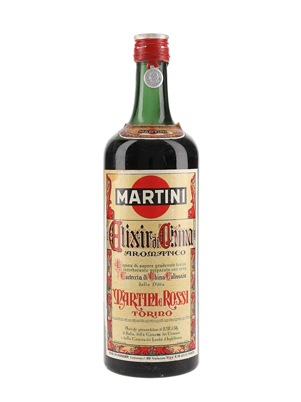A bottle of Martini Elixir China, a herbal liqueur flavoured with cinchona bark. We estimate this was bottled in the 1950s.