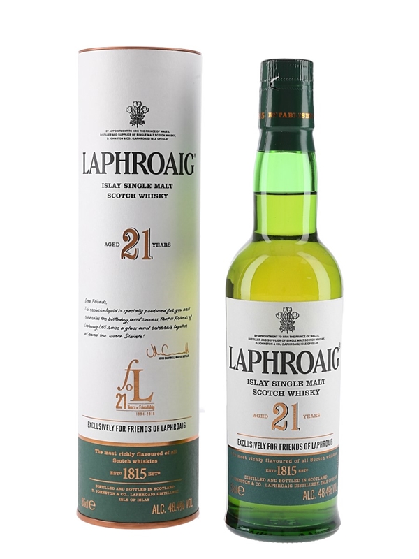A 35cl bottle of Laphroaig 21 Year Old Islay Single Malt Scotch Whisky, an exclusive bottling for the Friends of Laphroaig to celebrate the club's 21st birthday in 2015. This whisky was distilled in 1993 and matured in first-fill bourbon casks.