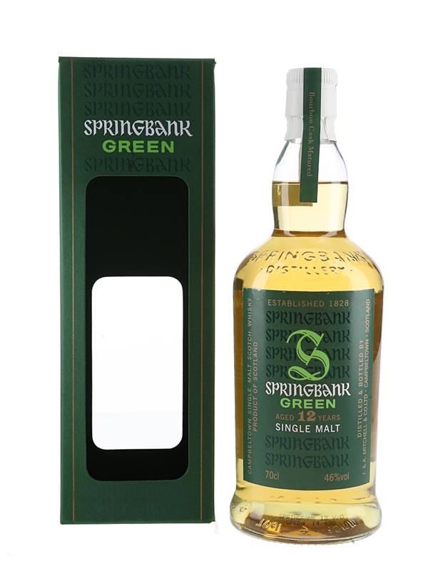 A bottle of Springbank Green 12 Year Old Campbeltown Single Malt Scotch Whisky bottled at 46% ABV. The bottling code indicates this was bottled in 2014.