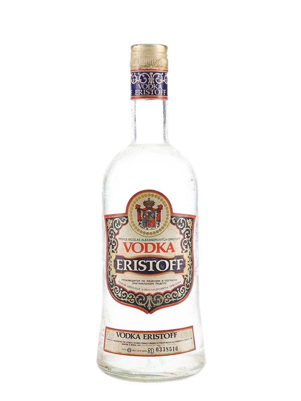 A bottle of Eristoff Vodka produced and bottled in Portugal by Martini & Rossi, under license and according to Prince Nicolas Alexandrovich Eristoff's original formula. We estimate this was bottled in the 1980s.