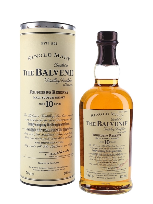A bottle of The Balvenie 10 Year Old Founder's Reserve Single Malt Scotch Whisky.
