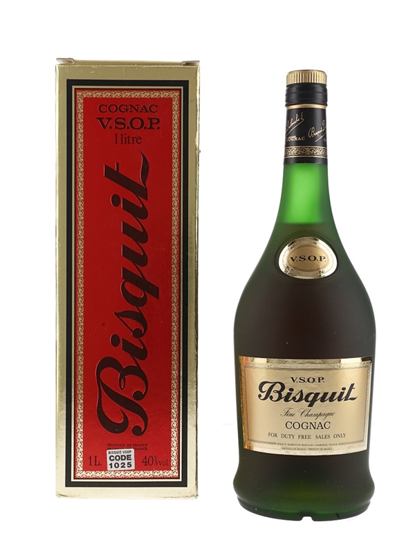 A litre bottle of Bisquit VSOP Fine Champagne Cognac. Bottled for the duty free market, we estimate in the 1980s.
