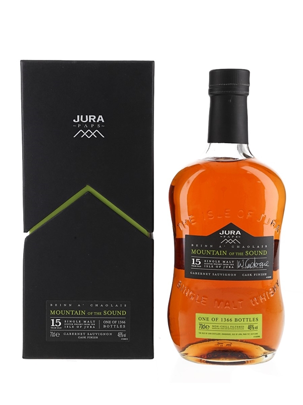 A bottle of Jura Paps 15 Year Old, named after one of the highest peaks on Jura: Mountain Of The Sound, finished in Cabernet Sauvignon casks.