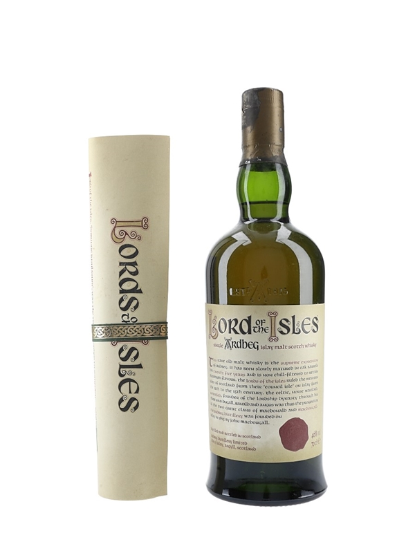 A bottle of Ardbeg Lord of the Isles Single Islay Malt Scotch Whisky, matured for 25 years and bottled at 46% ABV. It was first launched in 2001 and production continued until 2007. This is presented with a scroll telling the story of Somerled, a Celtic-Norse warlord and the first Lord of the Isles.