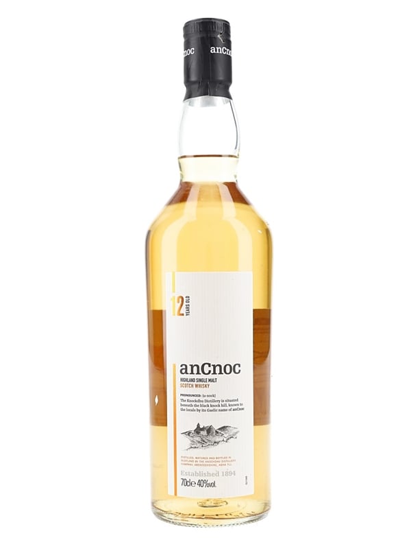 A bottle of AnCnoc 12 Year Old Highland Single Malt Scotch Whisky produced at Knockdhu distillery.