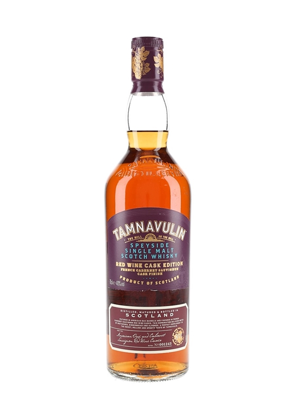A bottle of Tamnavulin Red Wine Cask Edition Single Malt Scotch Whisky. This was matured in American oak barrels and finished in French Cabernet Sauvignon wine casks.
