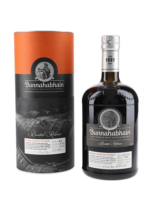 A limited release bottle of Bunnahabhain 2003 Pedro Ximenez Finish Single Malt Scotch Whisky. This was distilled on 24 March 2003, matured in second fill sherry butts and finished for three years in first fill Pedro Ximenez sherry butts before being bottled on 21 June 2017.