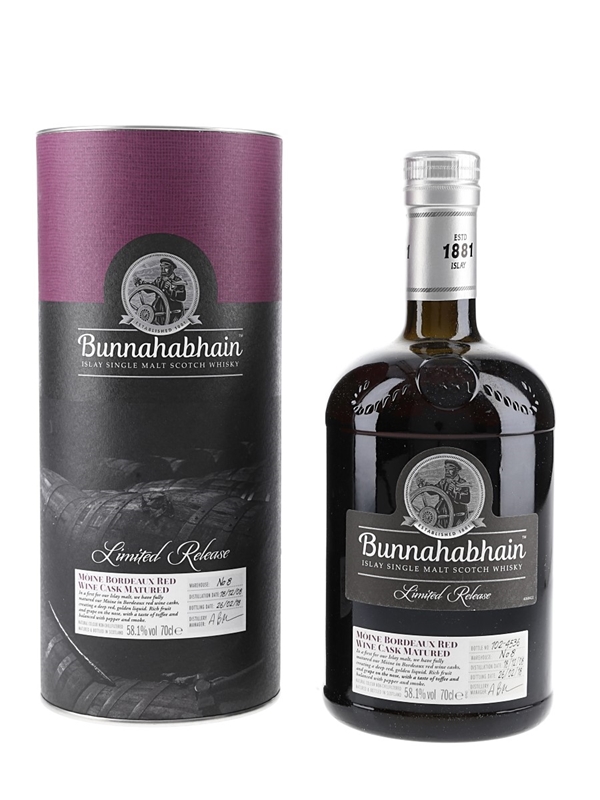 A bottle of Bunnahabhain Moine Bordeaux Red Wine Cask Islay Single Malt Scotch Whisky. This was distilled on the 18 December 2008 and botted on 26 February 2018