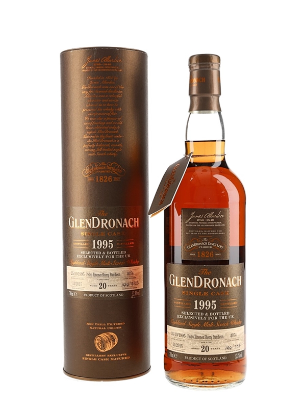 A bottle The Glendronach 12 Year Old. This was distilled on 25 October 1995, matured in a single Pedro Ximénez sherry puncheon, and bottled in November 2015 exclusively for the UK market.