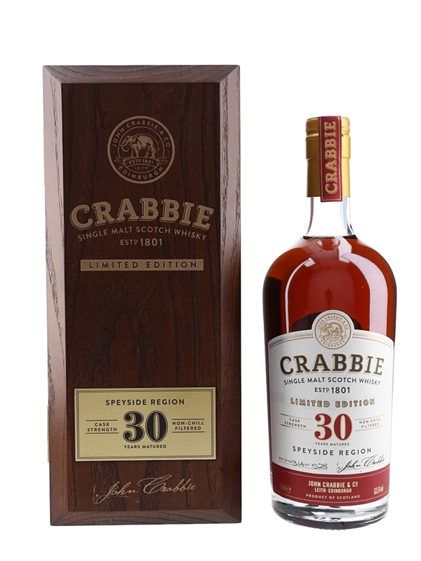 A bottle of Crabbie 30 Year Old single malt whisky, distilled at an undisclosed Speyside distillery, matured in a single cask and bottled at cask strength on the 22nd July 2019.
