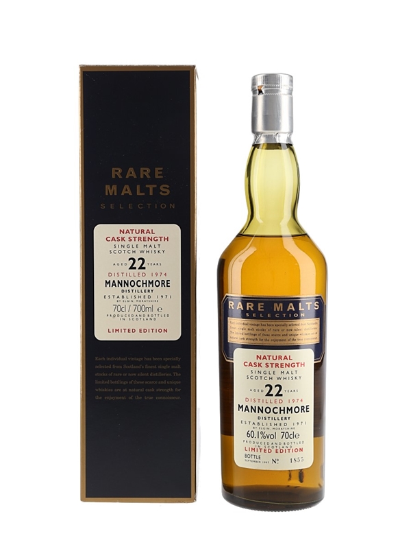 A bottle of Mannochmore 22 Year Old Single Malt Scotch Whisky. This was distilled in 1974 and bottled at a natural cask strength of 60.1% ABV in September 1997 for Diageo's now-discontinued Rare Malts Selection.