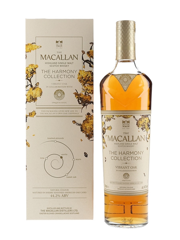 A bottle of The Macallan Vibrant Oak Highland Single Malt Scotch Whisky from The Harmony Collection. This was matured in a combination of sherry seasoned oak and bourbon casks before being bottled at 44.2% ABV.
