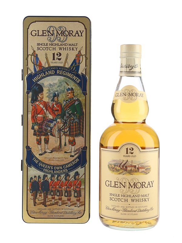 A bottle of Glen Moray 12 Year Old Single Highland Malt Scotch Whisky in a Scotland's Historic Highland Regiments tin. This tin depicts The Queen's Own Cameron Highlanders. We estimate this was bottled in the 1980s.