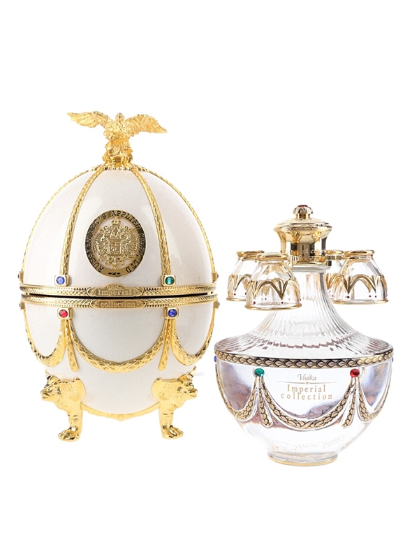 The presentation box contains a White Fabergé style egg, decorated with crystal and gold detail and topped with a gold eagle. Inside the egg is a decanter containing super premium vodka, distilled from wheat and rye with water from Lake Ladoga, and four small glasses with gold and enamel decoration.