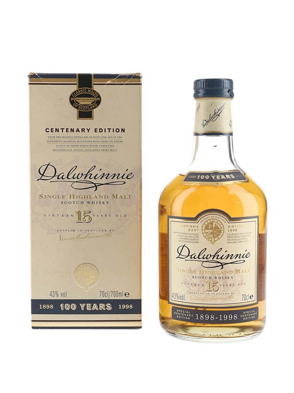 A bottle of Dalwhinnie 15 Year Old Single Highland Malt Scotch Whisky Special Centenary Edition bottled in 1998.