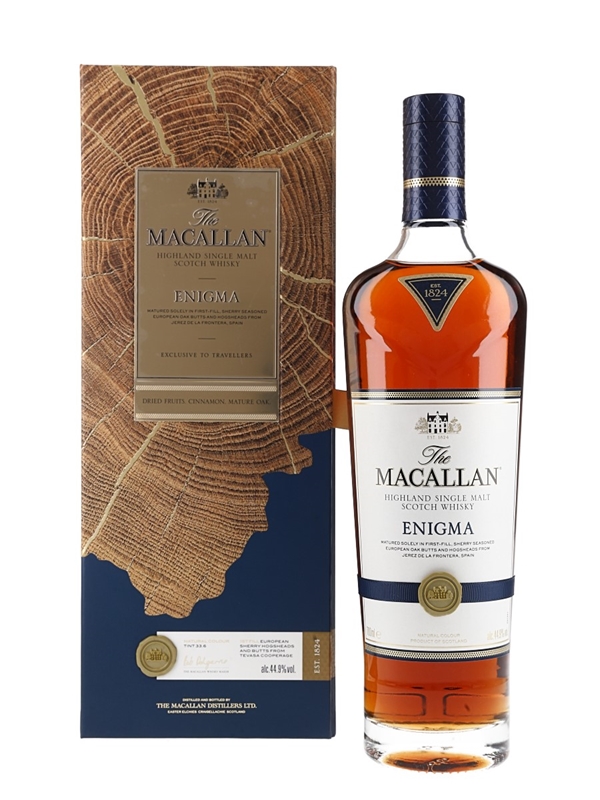 A bottle of The Macallan Enigma Highland Single Malt Scotch Whisky. This travellers exclusive release was aged in sherry seasoned European oak butts and hogsheads from Jerez de la Frontera, Spain.