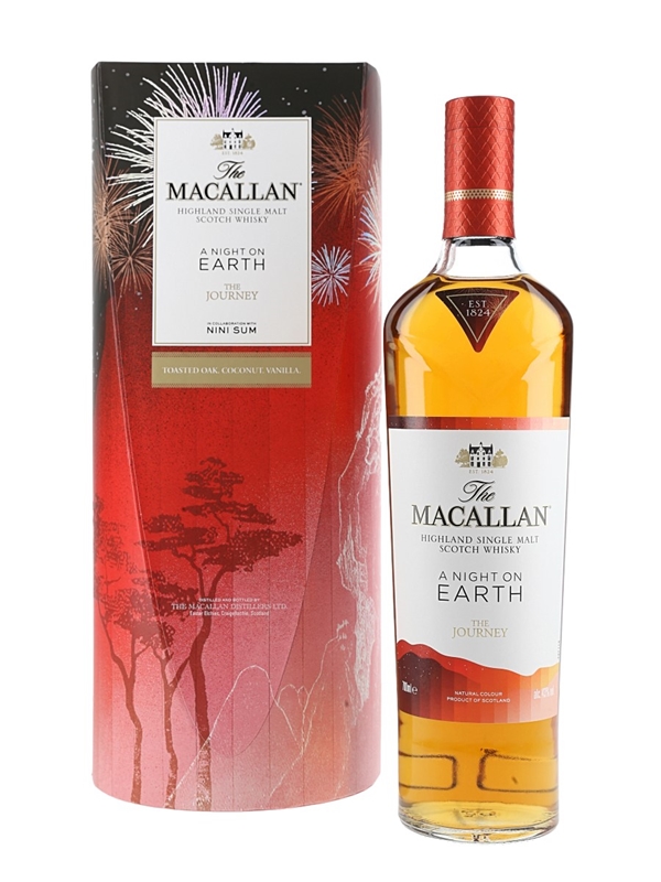 A limited edition bottle of Macallan A Night on Earth The Journey Highland Single Malt Scotch Whisky, celebrating the joy of New Year's Eve, known in Scotland as Hogmanay. This was matured in combination of first-fill American ex-bourbon barrels, along with European and American sherry-seasoned oak casks before being bottled at 43% ABV. The packaging was designed by Chinese visual artist Nini Sum.