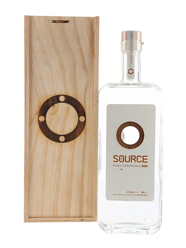 A bottle of Source Pure Cardrona Gin hand distilled and bottled in New Zealand by Cardrona Distillery Limited, in the pristine Southern Alps. This was produced with locally foraged rosehip, together with traditional juniper, coriander seed, angelica root, lemon and orange zest, all vapour distilled.