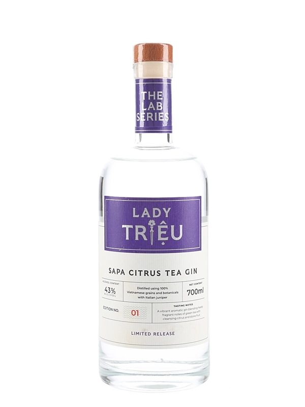 A bottle of Lady Trieu Sapa Citrus Tea Gin produced in Vietnam and bottled at 43% ABV.