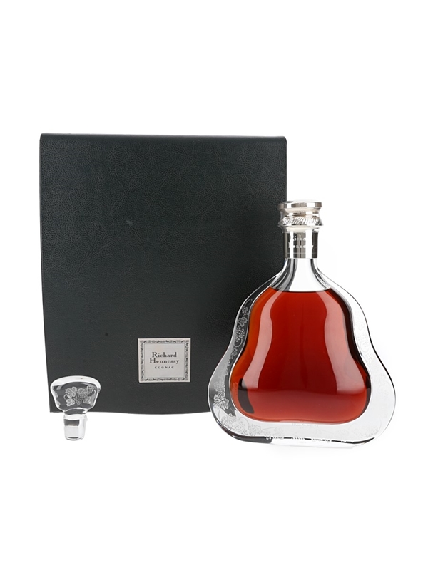 A bottle of Richard Hennessy Cognac second edition, blended from eaux-de-vie laid down by successive generations of the Hennessy family and named after the founder of the house. This is presented in a Baccarat crystal decanter and comes with a crystal stopper.