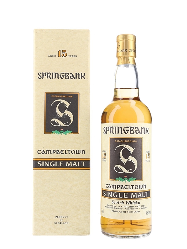 A bottle of Springbank 15 Year Old Campbeltown Single Malt Scotch Whisky with the 'Green Thistle' on the label. We estimate this was bottled in the 1990s.