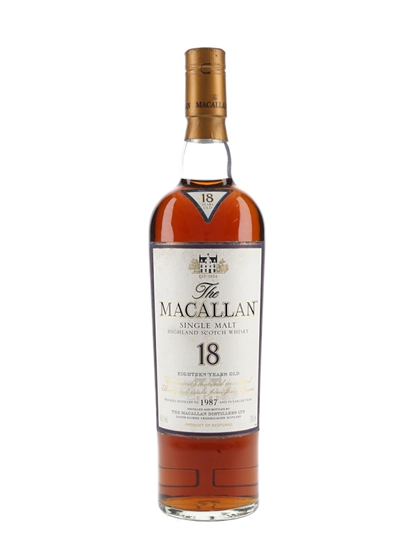 A bottle of The Macallan 18 Year Old Highland Single Malt Scotch Whisky, matured in sherry casks from Jerez, Spain, consisting of whiskies distilled in 1987 and in earlier years.