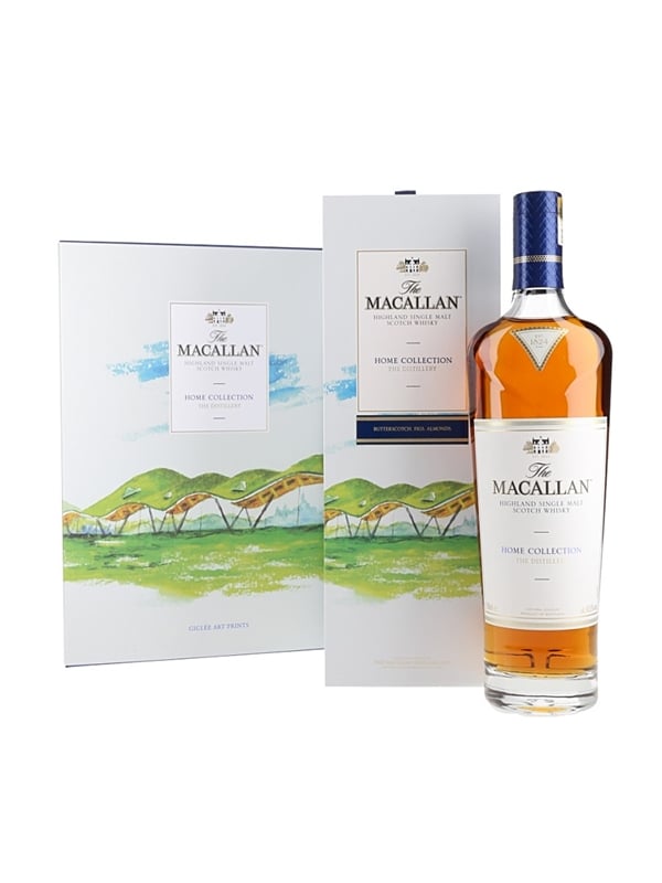 A bottle of The Macallan Home Collection The Distillery Single Malt Scotch Whisky. This lot comes with a set of three limited edition Giclée art prints by Colin Rizza. This is the first in the Home Collection series.